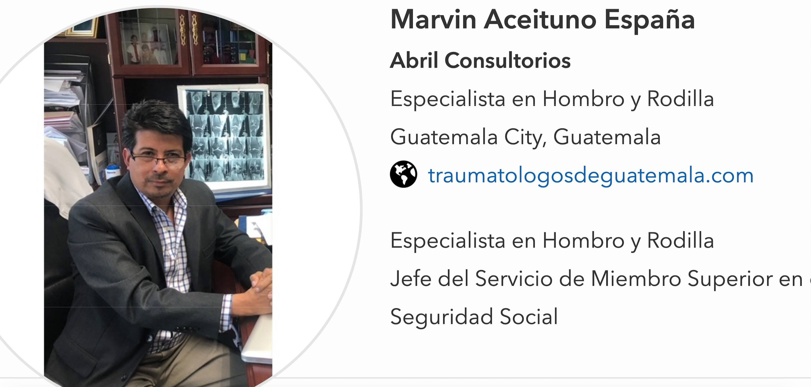 Socio fundador, Ex- directivo y miembro de Sociedad Nacional de Artroscopia de Guatemala.